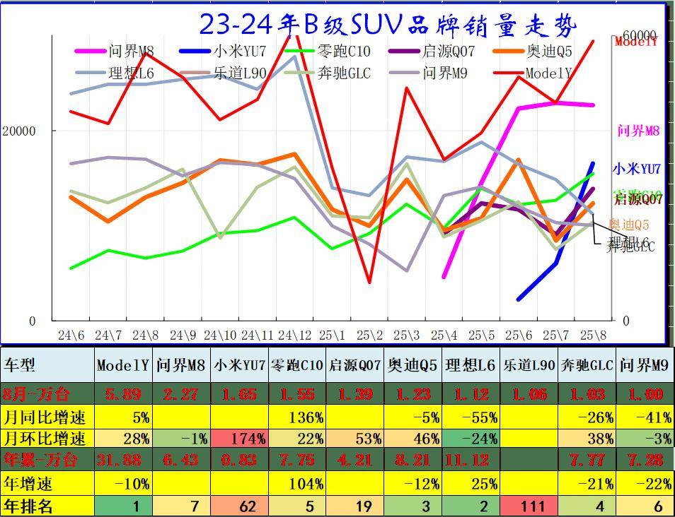 B級(jí)SUV 2025年8月批發(fā)35.15萬(wàn)臺(tái),占批發(fā)份額26.1%,批發(fā)較去年同期同比增長(zhǎng)3%,批發(fā)環(huán)比今年上月增長(zhǎng)15%;2025年8月零售較去年同期同比下降4%,零售環(huán)比今年上月增長(zhǎng)12%。2025年1-8月批發(fā)數(shù)量238.52萬(wàn)臺(tái),廠家批發(fā)銷售累計(jì)增幅5%;2025年1-8月國(guó)內(nèi)零售數(shù)量206.31萬(wàn)臺(tái),零售累計(jì)增幅2%。