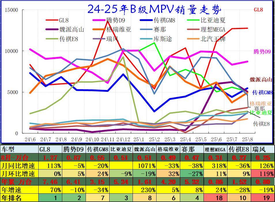 MPV市場(chǎng)的高增長(zhǎng)階段已經(jīng)改為低增長(zhǎng)趨勢(shì)。GL8近期表現(xiàn)較強(qiáng),比亞迪與騰勢(shì)和傳祺的MPV表現(xiàn)超強(qiáng),日系的MPV優(yōu)勢(shì)迅速下降。