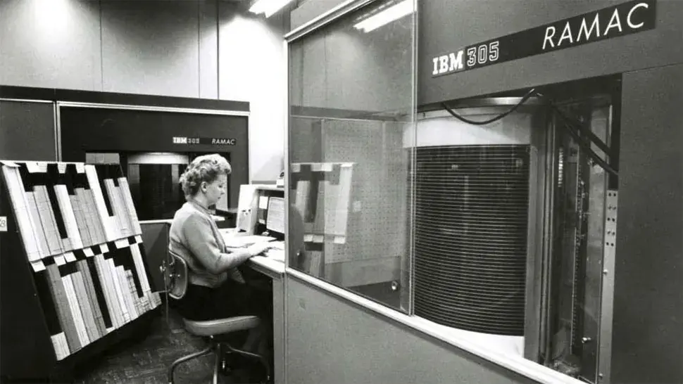 ▲ 硬盤與 IBM 305 計算機系統組合而成的系統,體積有一個房間那么大