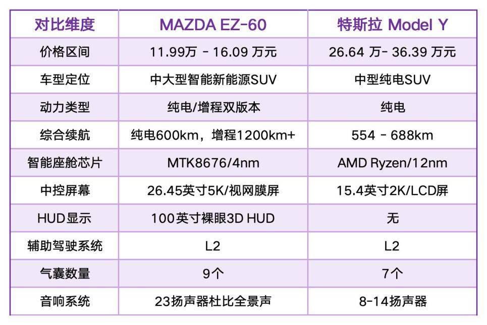 縱觀整個汽車市場,與EZ-60形成最直接對比的莫過于特斯拉ModelY:EZ-60以近乎一半的價格,提供了更大的車身尺寸、更豐富的動力版本選擇、更長的續航、更強大的芯片、更高端的屏幕和音響、更多的氣囊數量以及與之相當的智能駕駛輔助功能。這種“價格減半,體量升級”的策略,打破了消費者“一分錢一分貨”的傳統認知,直擊購車核心痛點。