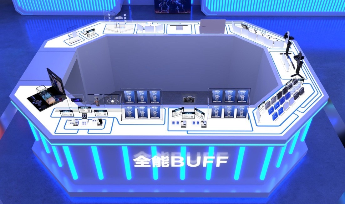 三星品牌存儲展臺位于上海國際博覽中心E7展館S101區域,以炫酷的藍色線條勾勒出神秘的科技氣息,非常顯眼好找。展臺延續了“滿BUFF裝備庫”的主題,即以全能的存儲產品,全方位滿足用戶的存儲需求,并將存儲最新科技與極致娛樂體驗帶給ChinaJoy所有玩家,內部設置各類“BUFF”體驗區域等你來探索打卡。(下圖為三星品牌存儲展臺3D效果展示)