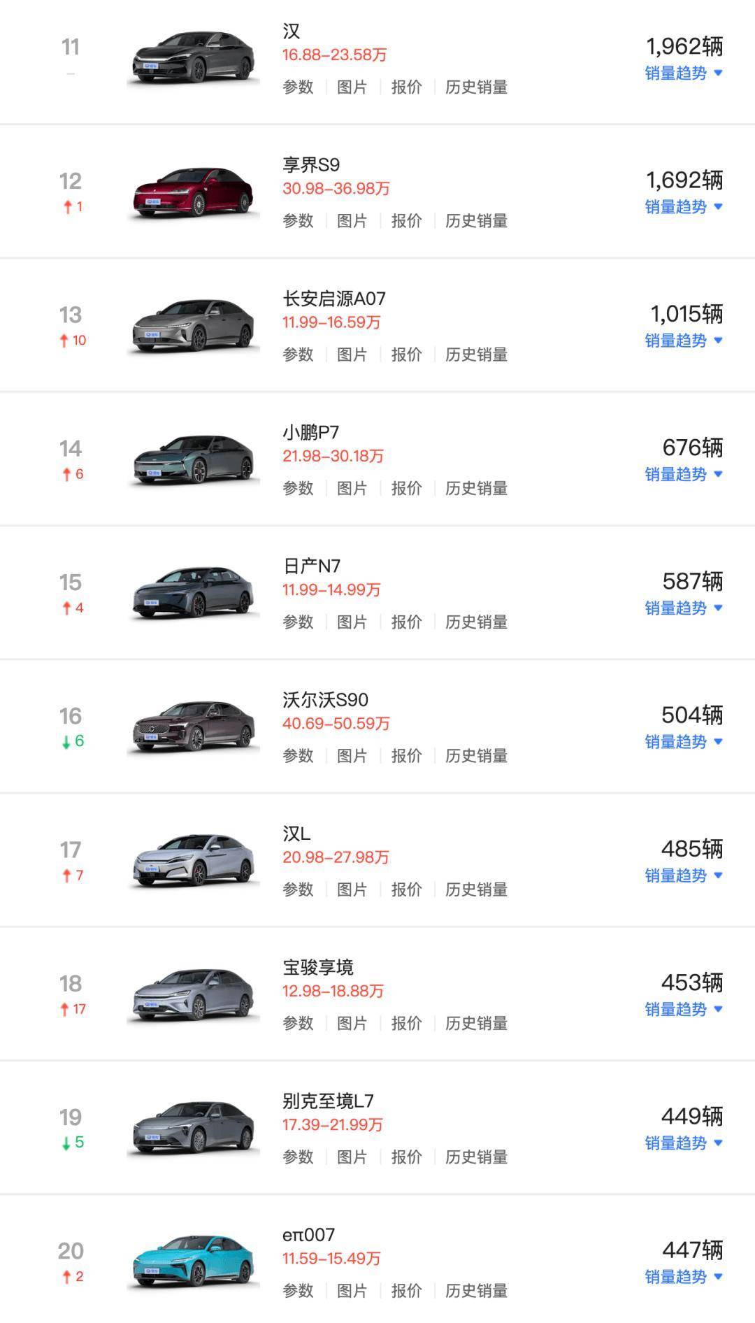 除上述車型之外,包括比亞迪漢、享界S9、長安啟源A07、小鵬P7、日產N7均進入榜單前十五名,2月銷量分別為1962輛、1692輛、1015輛、676輛、587輛,年內累計銷量分別為4109輛、2962輛、1771輛、1530輛、1565輛。其中,日產N7是東風日產全棧自研天演架構下的首款車型,也是面向主流家庭用戶需求正向開發的全新車型,于2025年4月上市,目前售價為11.99-14.99萬元,搭載NISSAN OS系統及高通驍龍8295芯片,以及搭載160kW/200kW前單電機與58kWh/73kWh電池包。