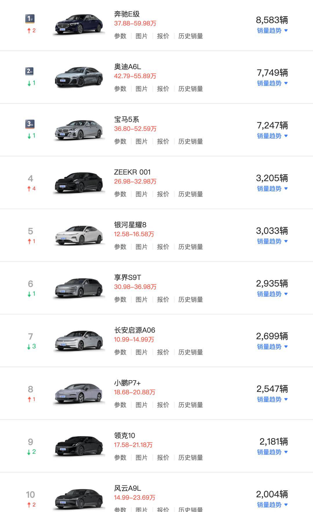 細分到中大型車市場來看,中大型轎車銷量TOP15榜單中,2月進入榜單前三的車型均來自BBA,分別為北京奔馳旗下奔馳E級、一汽奧迪旗下奧迪A6L、華晨寶馬旗下寶馬5系,銷量分別為8583輛、7749輛、7247輛。作為參考,1月奧迪A6L、寶馬5系、奔馳E級銷量分別為15660輛、12976輛、12119輛。截至2月底,奧迪A6L、奔馳E級、寶馬5系累計銷量分別為23409輛、20702輛、20223輛。
