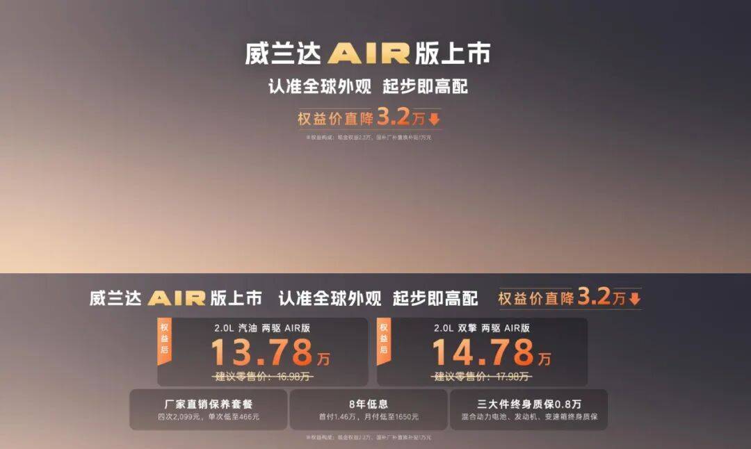 以不到14萬的價格買到雅閣e:PHEV這樣一臺插混B級轎車足以給人不小震撼,但這只是國內汽車市場合資車內卷大戰的開胃菜,廣汽豐田便推出全新換代威蘭達AIR版,2.0L汽油版權益價低至13.78萬元,混動版僅需14.78萬元。三年前,這一預算或許只能選擇合資品牌的小型SUV,如今卻能購入一臺緊湊型SUV。盡管為控制成本,威蘭達AIR版取消了8155芯片及部分舒適性配置,但仍保留了10安全氣囊、TSS 4.0智駕系統及后雙叉臂獨立懸架,同時推出“三大件終身質保”這一在合資品牌中罕見的政策。