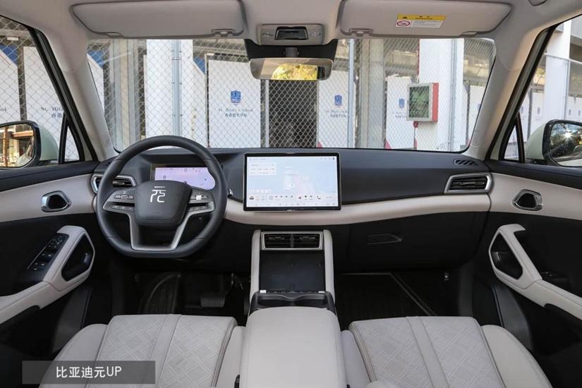 元UP反倒是通過更多撞色,讓座艙看上去更個性了,門板等區(qū)域也有更多特別裝飾結構。而在中控臺上是8.8+12.8英寸雙液晶屏,并配有可提供基礎信息顯示的8英寸HUD抬頭顯示,三屏組合還是很好用的,配合單色氛圍燈與6揚聲器,艙內氛圍支持也不錯。