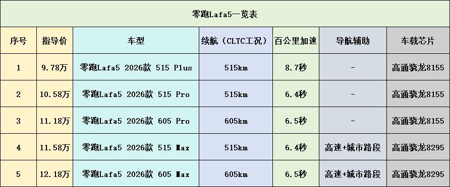 為了能夠更為直觀的對比零跑Lafa5各個配置車型版本,我制作的了一個一覽表以供大家參考。