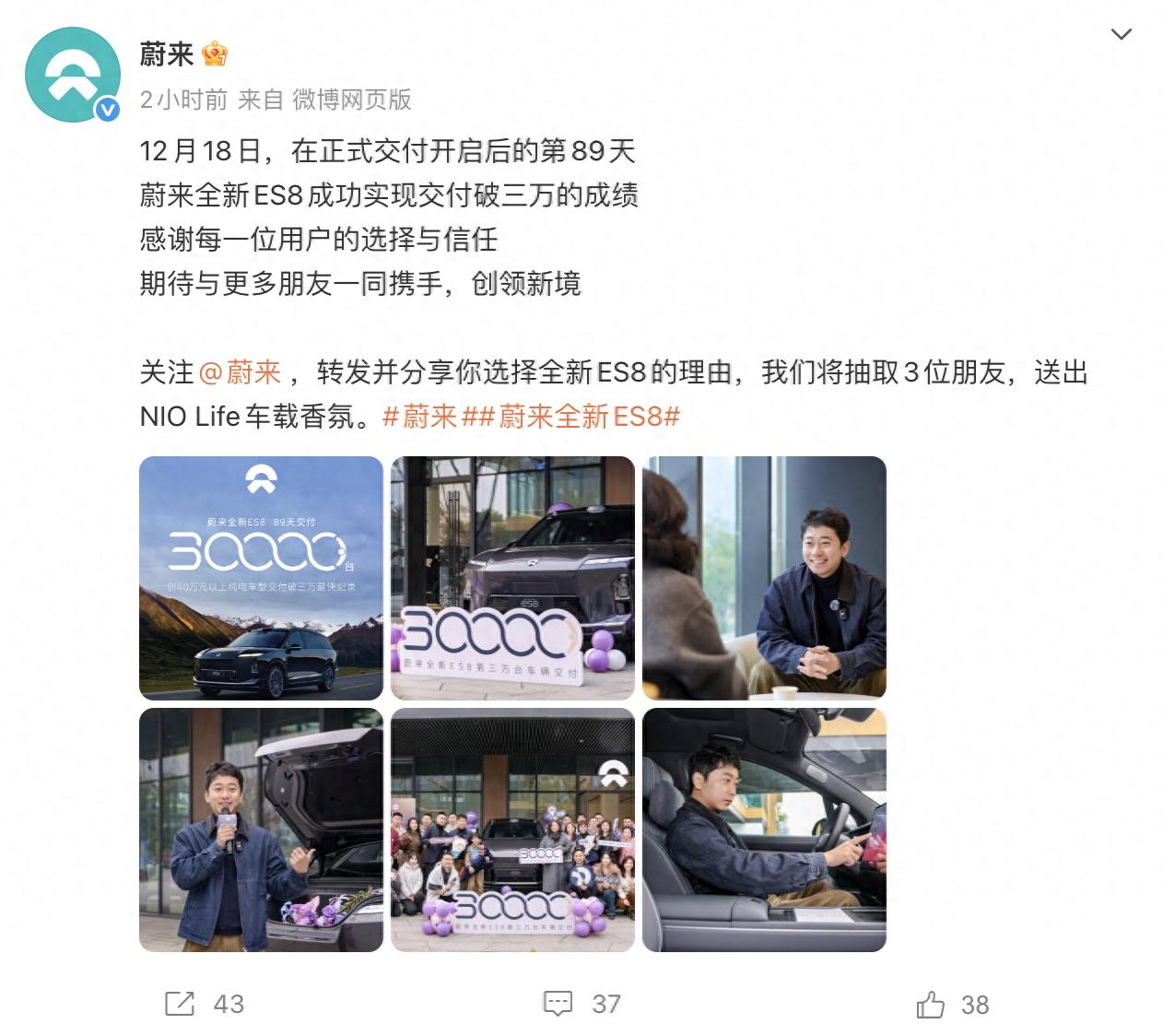 12 月 18 日,蔚來官方宣布全新 ES8 達成第 30000 臺交付,從交付開啟到這一里程碑僅用時 89 天,創下 40 萬元以上純電車型交付破三萬的最快紀錄。更值得關注的是,其從 2 萬臺到 3 萬臺的交付僅耗時 19 天,增速持續領跑高端純電市場。