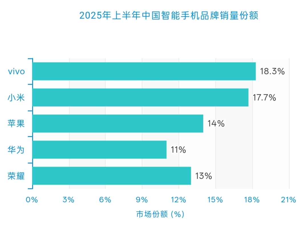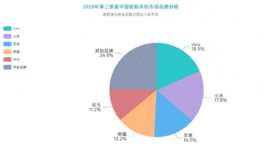以下圖表直觀地展示了2025年第三季度中國智能手機市場的品牌份額分布。其中,vivo 和小米交替占據第一,蘋果穩居第三,榮耀和華為緊隨其后。