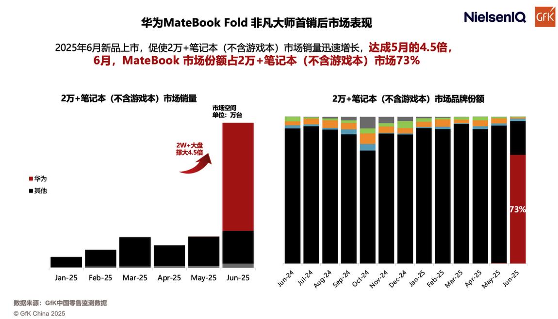 市場數據是檢驗產品成功與否的最好答案。根據GFK的數據顯示,華為MateBook Fold非凡大師在上市首月便展現出了強大的市場號召力,促使2W+筆記本(不含游戲本)市場銷量迅速增長,達到了5月的4.5倍,市場份額更是占到了該市場的73%。這一數字體現了鴻蒙電腦在高端市場的強勁競爭力。