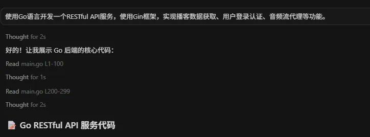 我們使用了以下Prompt:使用Go 語言開發(fā)一個RESTful API服務,使用Gin框架,實現(xiàn)播客數據獲取、用戶登錄認證、音頻流代理等功能。