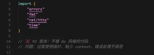 相比之下,M2在Go語言上也能生成代碼,但經常出現(xiàn)一些"不夠Go風格"的問題,比如過度使用指針、缺少context傳遞、錯誤處理不夠規(guī)范等。如圖所示: