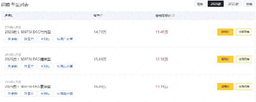 首先值得一提的是,大眾速騰L的售價區間在14.79萬~16.59萬,而優惠后的價格來到了11.49萬起。所以如果考慮買大眾速騰L,那么您的購車預算需要在14萬左右。