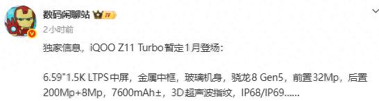 12 月 25 日消息,據博主“數碼閑聊站”今日爆料,iQOO旗下新機 iQOO Z11 Turbo 暫定明年 1 月登場。根據爆料信息,該機型在將搭載高驍龍 8 Gen 5,并配備一塊容量高達 7600mAh± 的電池。