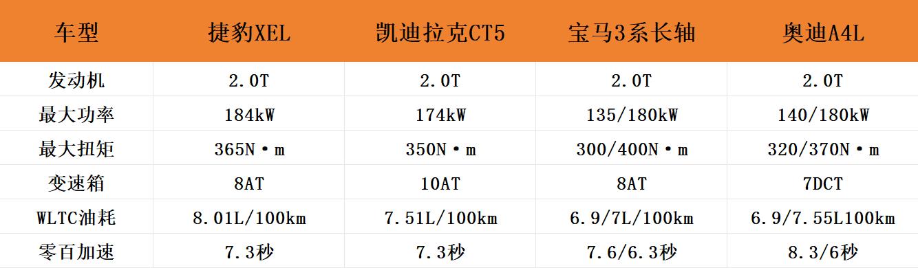 動力方面,捷豹XEL搭載了一臺2.0T發動機,它沒有高低功率之分,最大功率184kW,峰值扭矩365N·m,傳動部分與之匹配的是8AT變速箱。只看參數,捷豹XEL的發動機最大功率超過了凱迪拉克CT5以及寶馬3系和奧迪A4L的高功率版本,反映出了它厚道的一面。