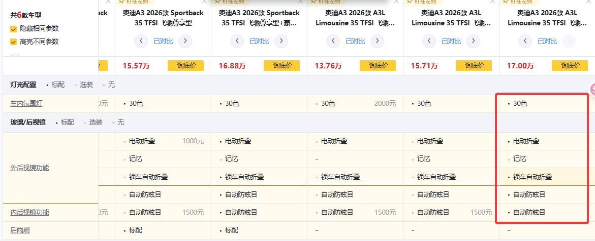 先看官方指導價:兩廂悅享版16.59萬、奧迪A3 2026款 Sportback 35 TFSI 飛馳尊享型18.99萬、尊享+豪華臻選包20.59萬;長軸悅享版16.99萬、奧迪A3 2026款 A3L Limousine 35 TFSI 飛馳尊享型19.39萬、頂配20.99萬。可以發現,長軸版比同配置兩廂貴4千,卻多了100mm軸距,后排腿能伸直,所以家用選長軸不虧,這4千花得值。