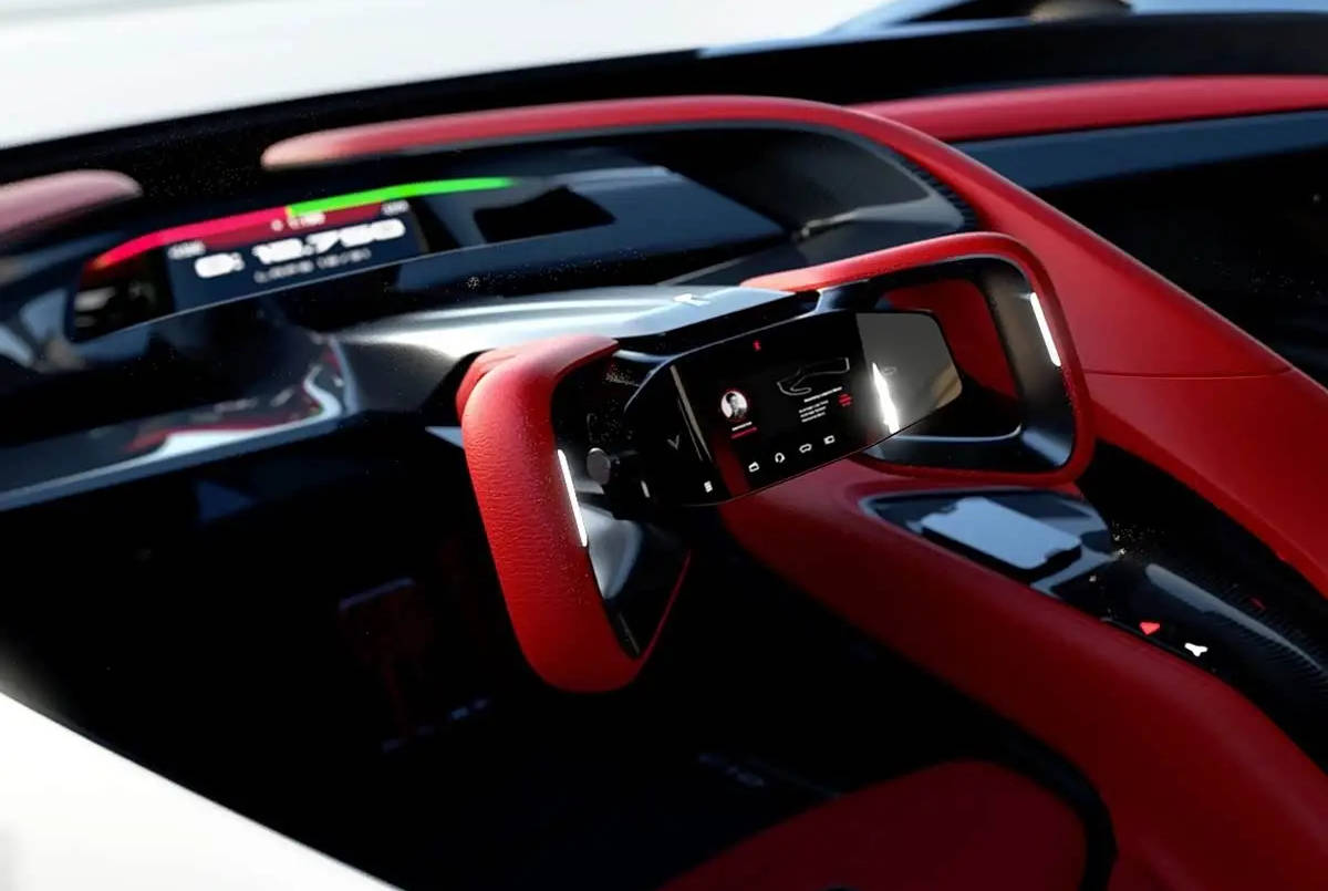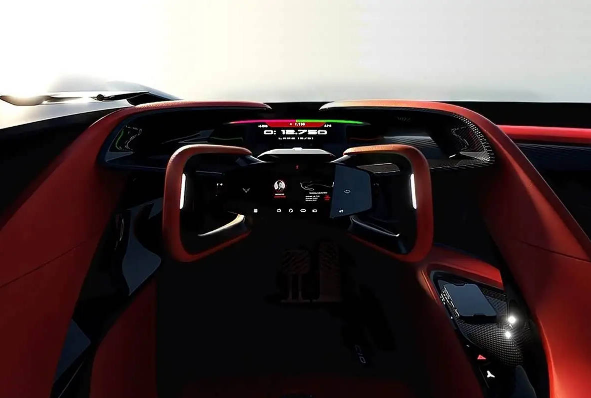 車輛內部則以簡約的內飾為基礎,一切功能和設計都以駕駛員為中心,整體中控臺面集成了緊湊的結構設計并搭配以性能數據為展示重點的全液晶顯示屏,同時 車輛還將搭配增強現實HUD,并顯示最基本的數據,避免在高速下使駕駛員分心,專注高速駕駛。