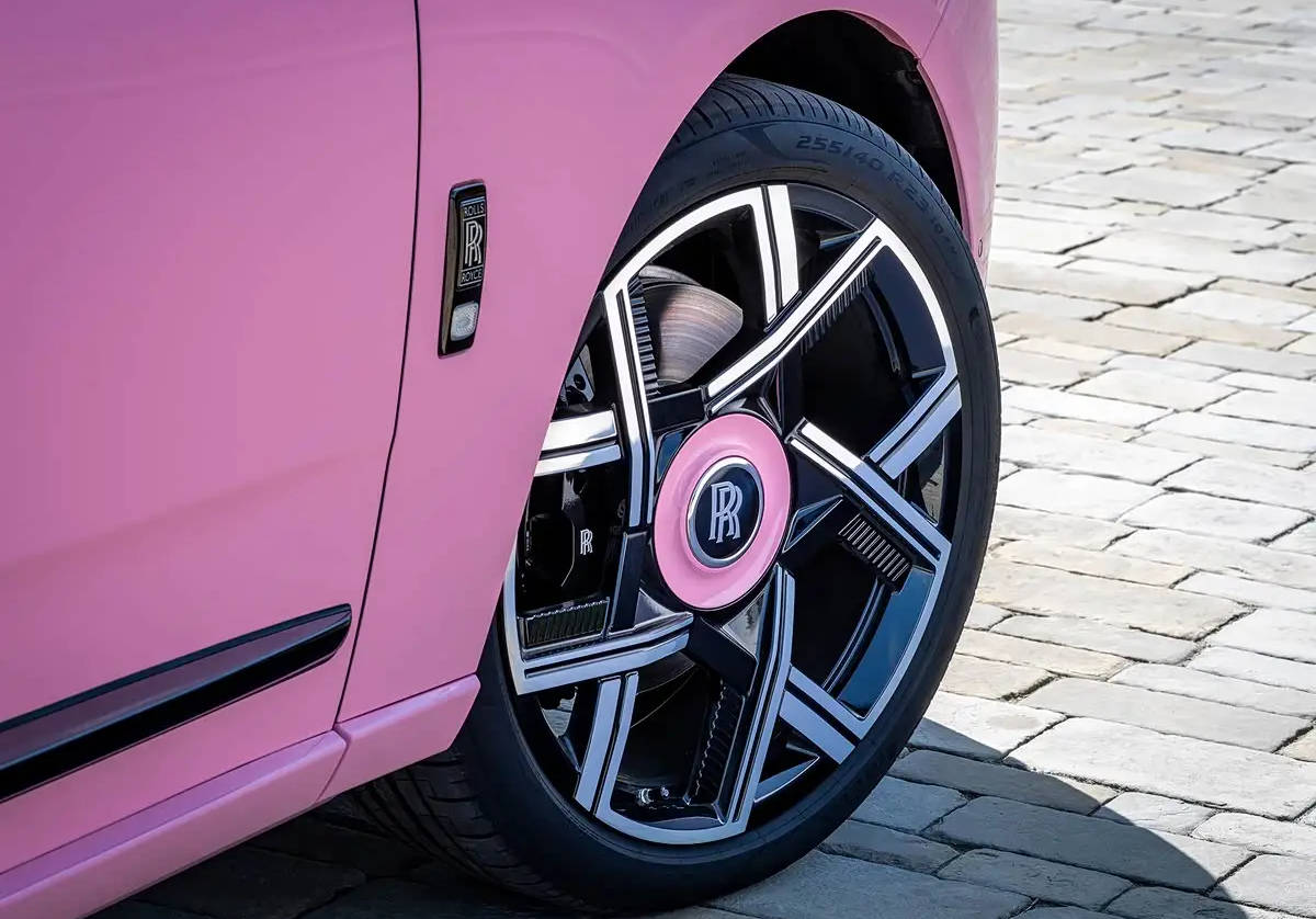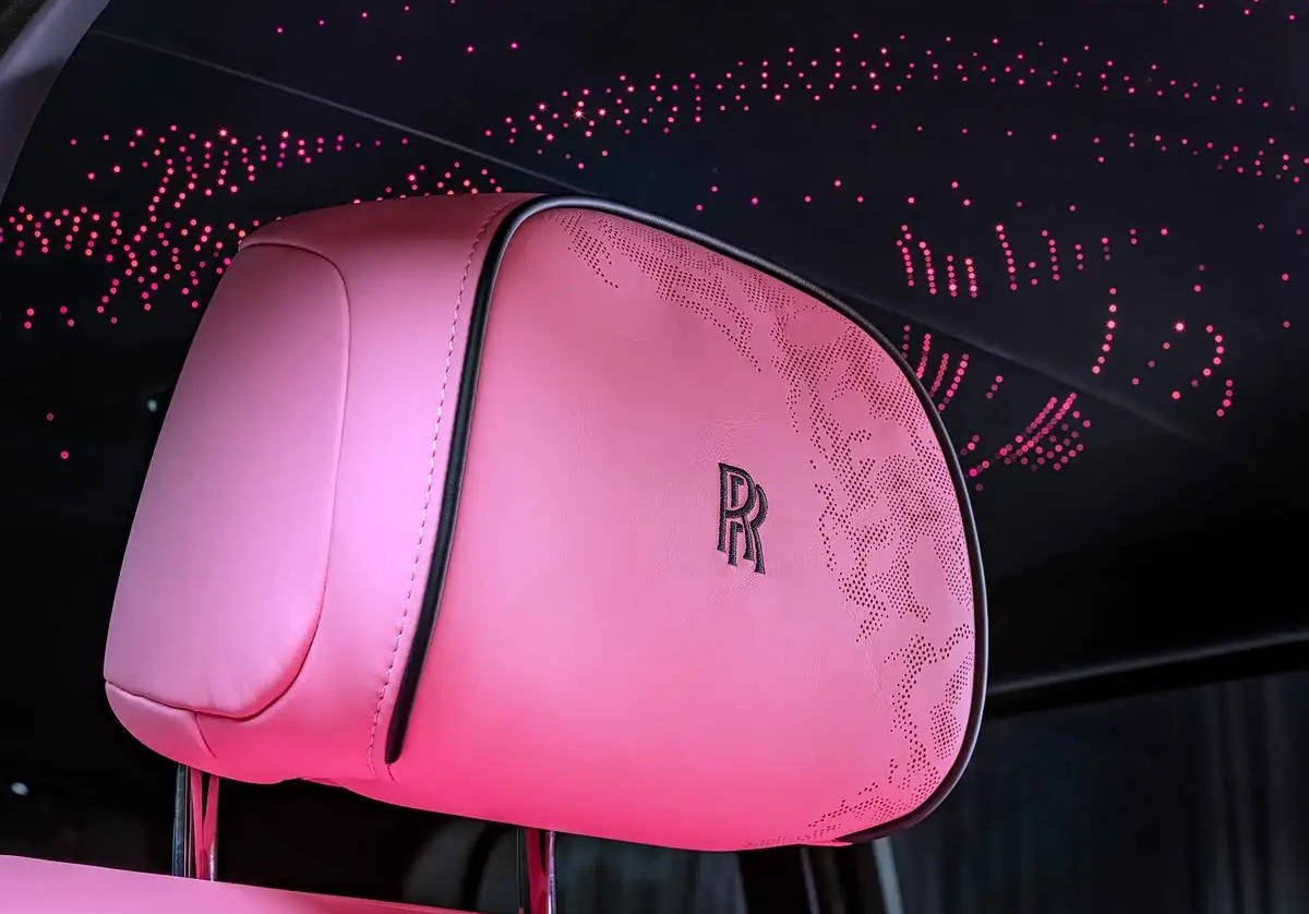庫里南Black Badge采用了“丹騫粉”色調,23英寸黑徽章鍛造輪圈中心也使用了這一顏色。車身C柱和車線上的“絲綢之魂”圖案呈現黑色。前排座椅采用“腮紅粉”皮革,配以特殊打孔設計,靈感來源于勞斯萊斯總部古德伍德上空的云朵變幻。