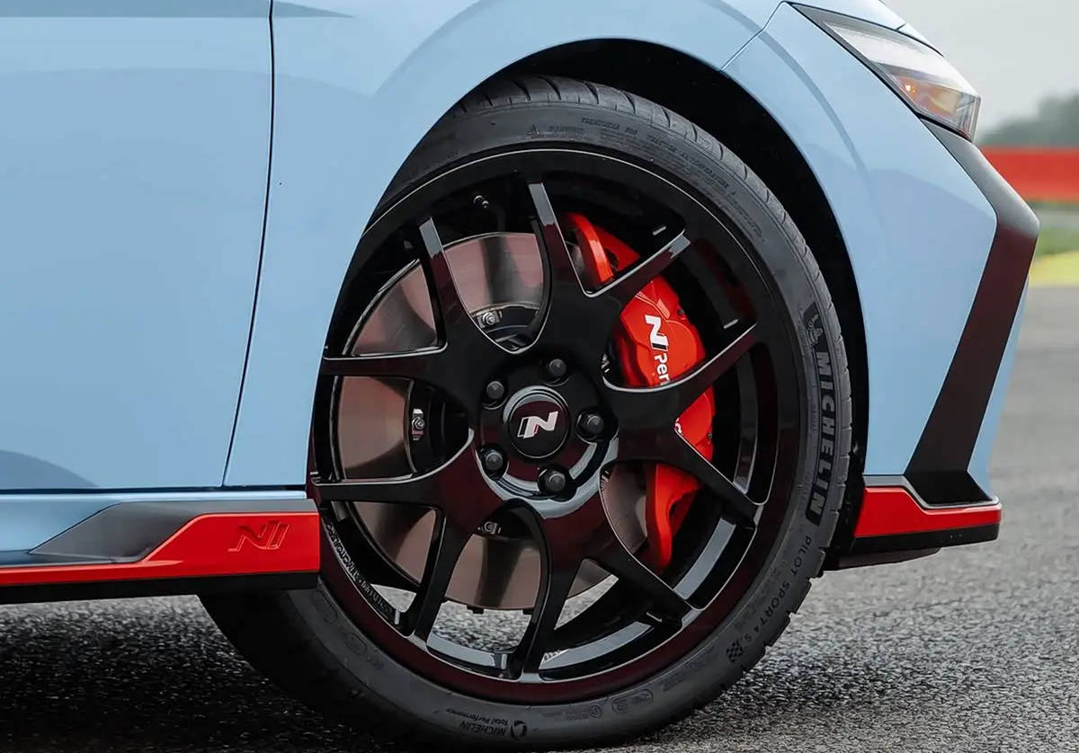 外觀方面,新車整體設計依舊遵循伊蘭特N的思路,但是加入了更多的空氣動力學套件。例如新車增加了紅色裝飾點綴的前唇擾流板,同時配備了雙五輻的19英寸N TCR鍛造輪圈。此外,新車還配備了前四活塞的固定式制動卡鉗,進一步提升整體賽道性能。