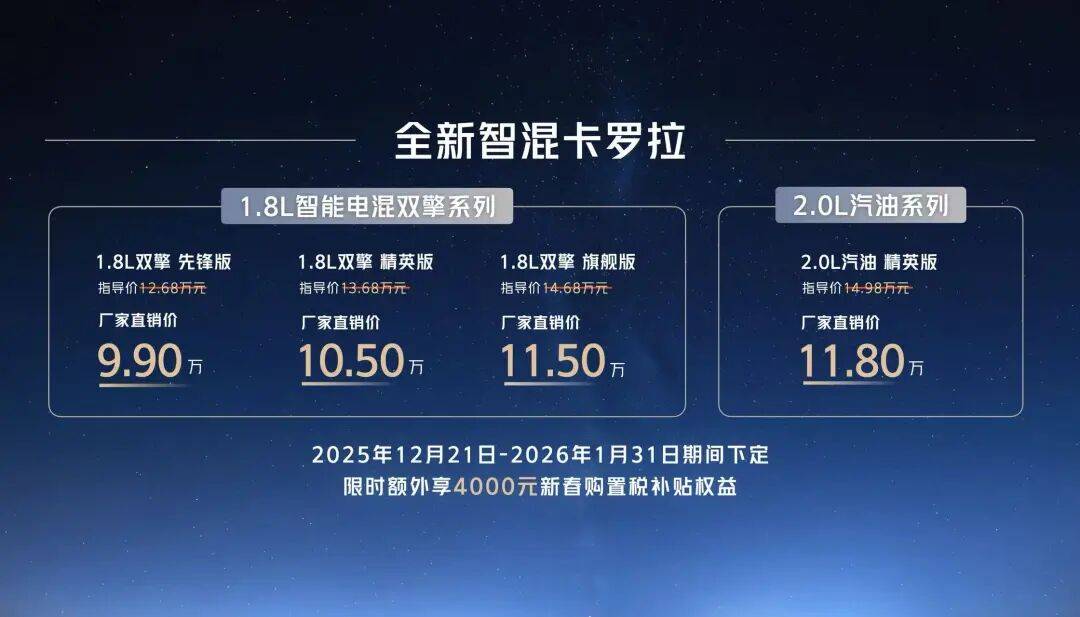 盡管2025年已經接近尾聲,但汽車市場的年末大戲依然精彩。一汽豐田也選擇在這一關鍵節點放出大招。12月21日,全新智混卡羅拉正式上市,售價9.9萬元起。