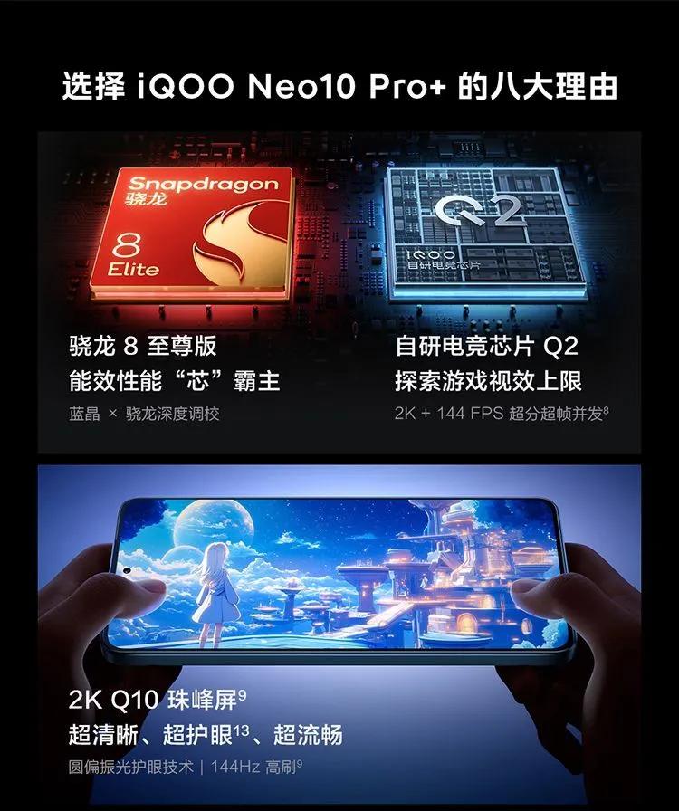 - iQOO Neo10 Pro+:驍龍8至尊版+LPDDR5X Ultra+UFS 4.1,原神須彌跑圖平均幀率60.2幀,1% Low幀56.8幀(幾乎無卡頓),自研芯片Q2支持1.5K+144FPS超分超幀;